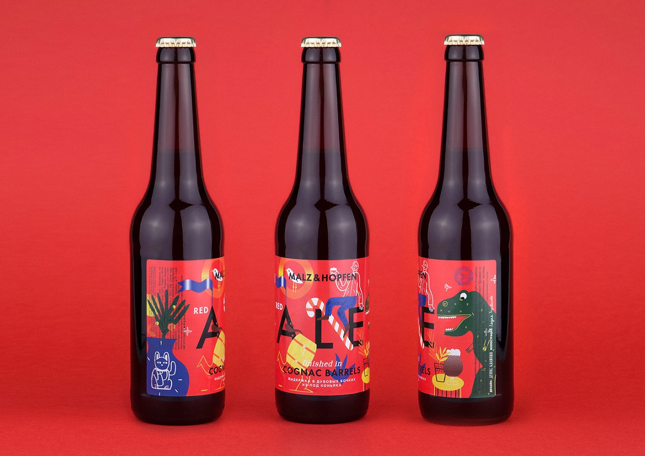 為了設計產品包裝,我了解了藝術家愛德華·馮·格魯茨納:他是著名的僧人。我們決定改變插圖形象,用生活畫描述他們的激情和釀造啤酒的故事。經過不斷實驗,并最終創造了和尚、歡樂的小丑,坐在一桶啤酒上,面帶微笑,享受著新口味的形象。在系列包裝中,我們還用到了傳統的橢圓形的老郵票作為設計元素,了勾勒的字母或是電影里面的角色——雙頭鷹帝國帝國斯托特、爬鐵門的水手。