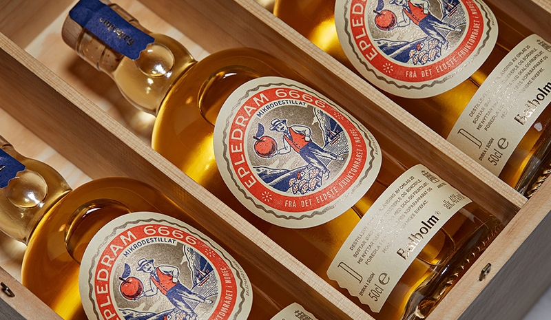 我們被要求為一種全新的生態(tài)蘋果白蘭地打造一個品牌平臺,使得人們重新對北歐食品和傳統(tǒng)飲料感興趣。我們正在尋找一種靈活的方式來傳達歷史上巴爾霍姆與水果相關(guān)的許多故事。在挪威的農(nóng)場里,水果的蒸餾是很常見的,由于一項允許蒸餾酒的新法律,微蒸餾的傳統(tǒng)正在挪威復(fù)興。為了慶祝這一復(fù)興,我們希望讓水果成為產(chǎn)品中心,作為一種真正的農(nóng)產(chǎn)品的象征。我們在包裝設(shè)計上的靈感來自復(fù)古水果包裝的語言和排版,采用復(fù)古插畫風(fēng)格為產(chǎn)品做系列包裝,能夠以水果靈活命名,并使用視覺語言為未來的擴展講故事。我們還為白蘭地酒對應(yīng)的水果設(shè)計了配套的包裝,使其作為農(nóng)產(chǎn)品的象征。